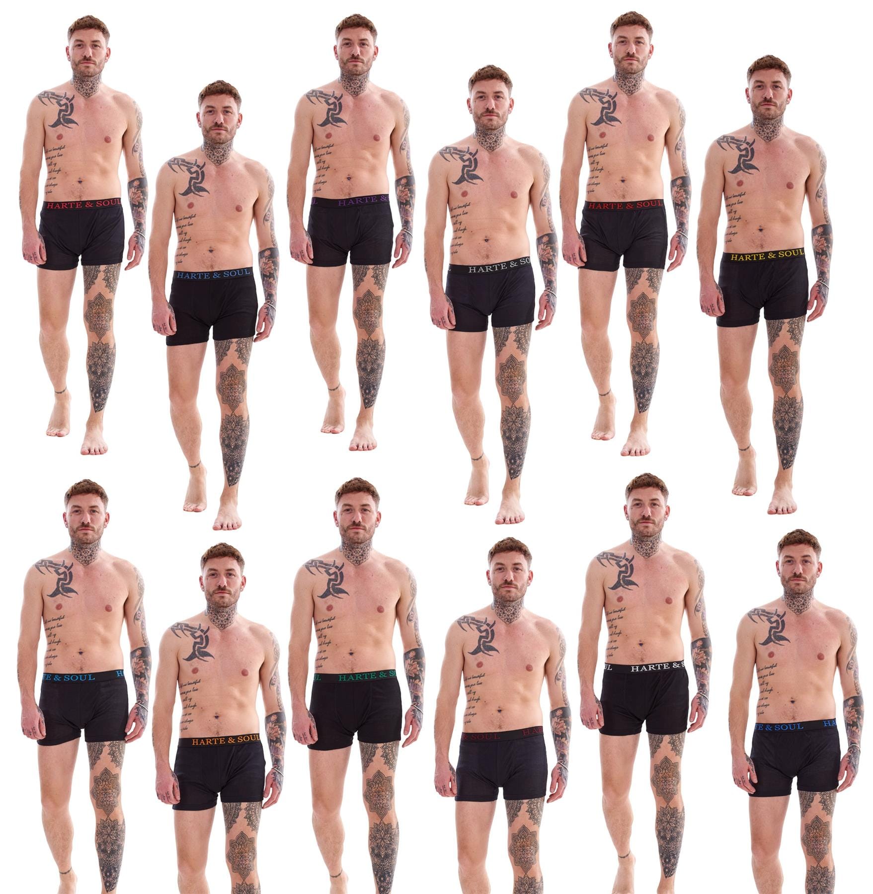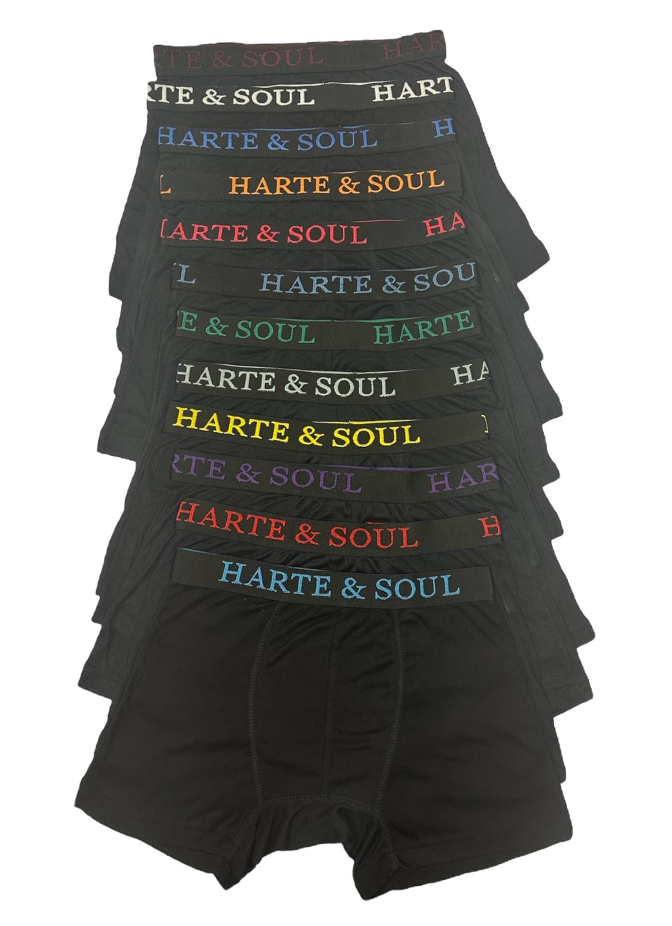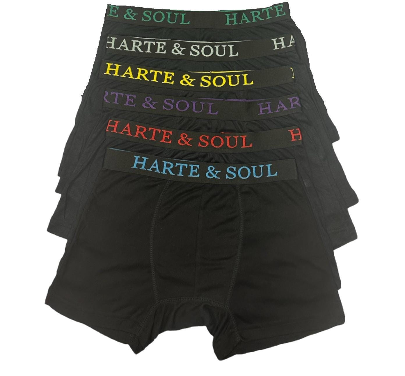 Black Pack – Timeless and versatile, this pack includes 12 classic black boxers, each featuring a contrasting jacquard waistband with the signature ‘Harte & Soul’ branding for a refined finish.