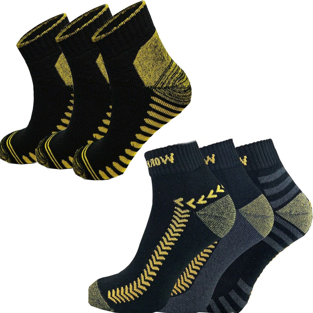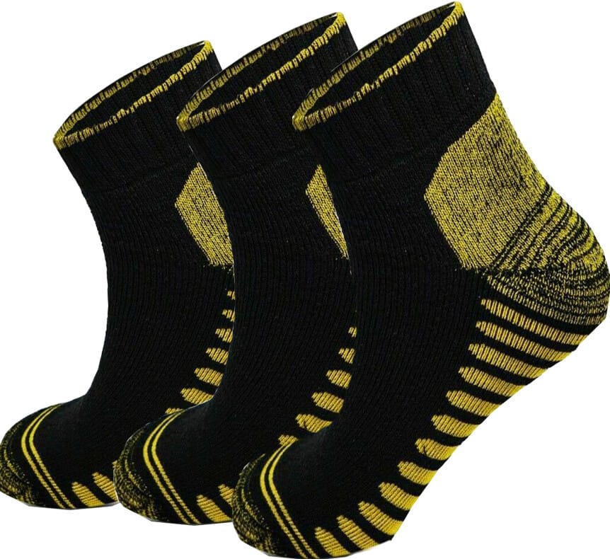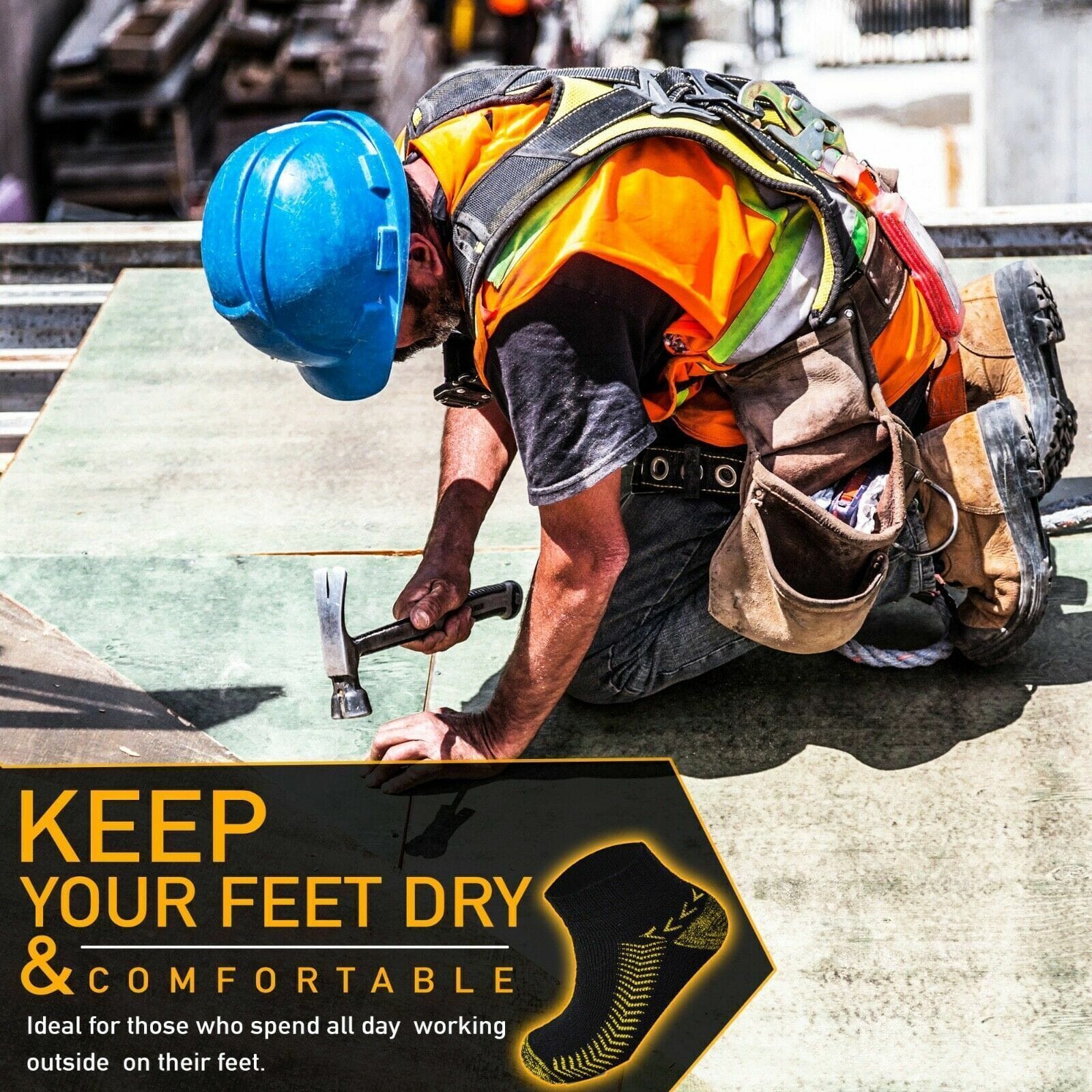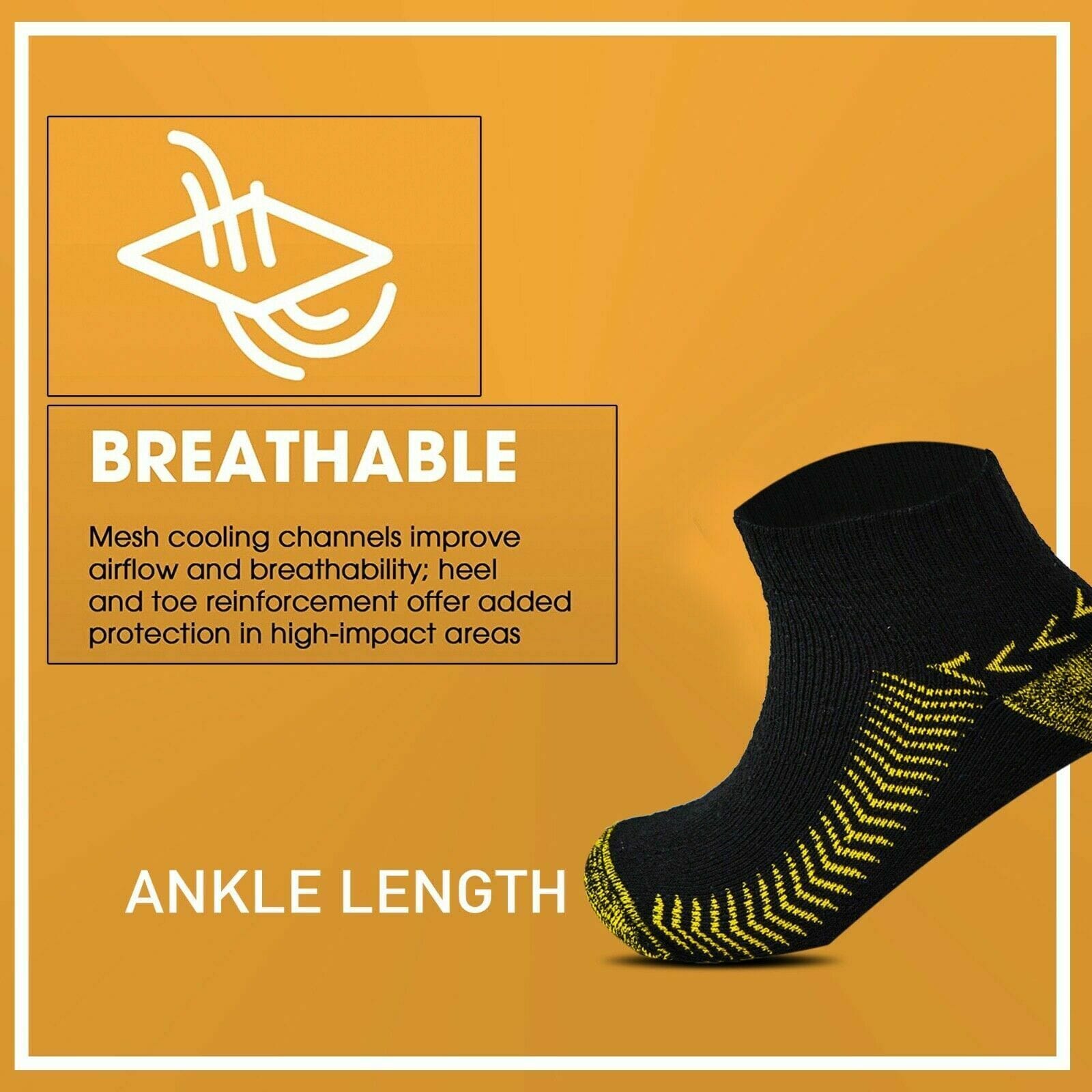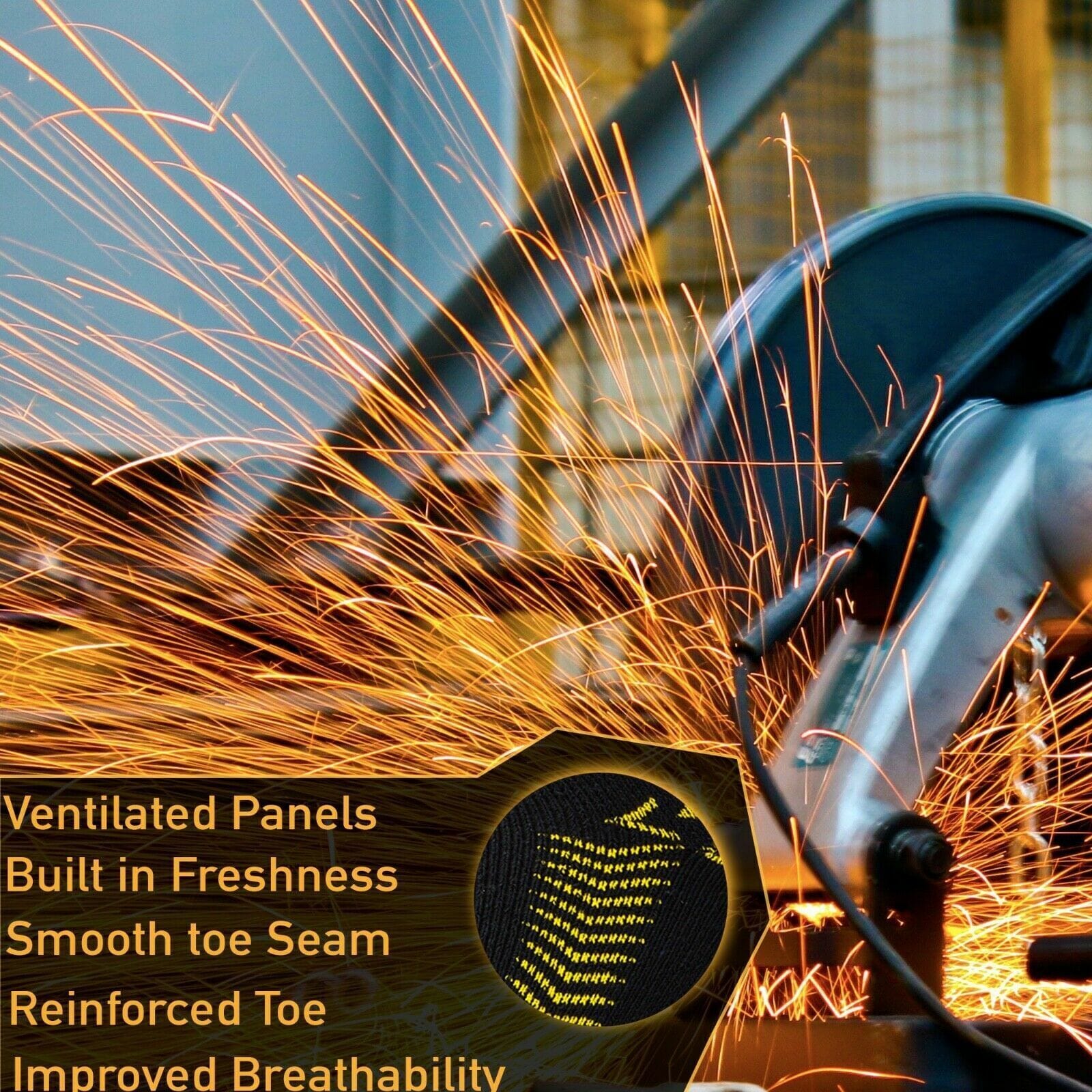 Designed with comfort welt tops and arch support, each pair is engineered for a snug fit without tightness, perfect for physically demanding days. Moisture-control fibres and a ventilated breathing channel keep your feet dry, cool, and blister-free.
